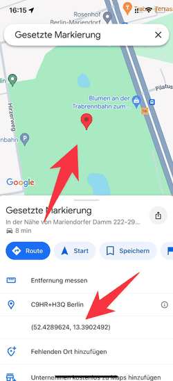 Um die Längen- und Breitengradkoordinaten (Lat, Lng) für einen bestimmten Punkt auf der Karte zu bekommen, können Sie die mobile App von Google Maps benutzen. So gehen Sie dabei vor: